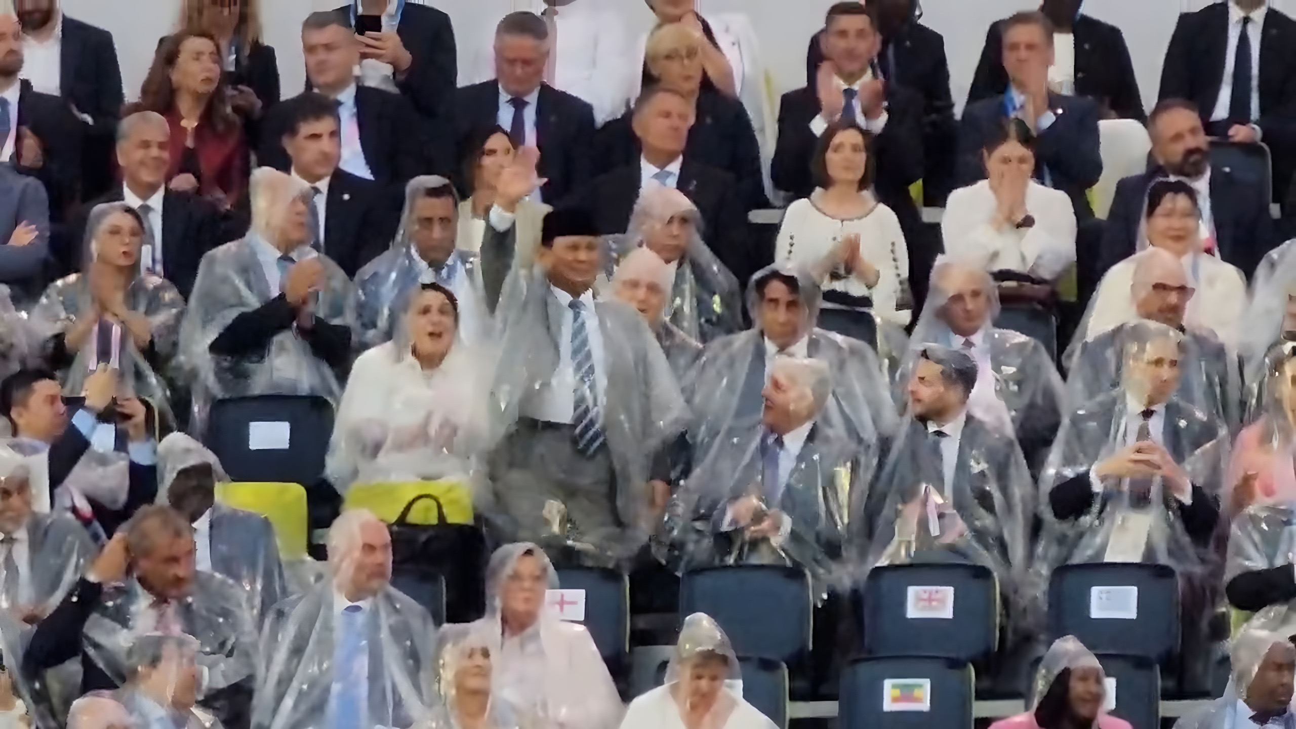 Dari tempat duduknya yang berada di tepi sungai Seine, Prabowo nampak berdiri ketika kontingen Indonesia melintas. Meski Paris diguyur hujan cukup deras, Prabowo yang mengenakan jas hujan transparan melambaikan tangan ke arah para atlet dan kontingen, dan memberikan semangat.
