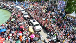 “Prabowo-Gibran, Prabowo-Gibran selamat bekerja!” seru masyarakat yang menyambut Prabowo di sepanjang jalan. Prabowo pun melambaikan tangannya seraya menyapa masyarakat dari mobil Maung itu.